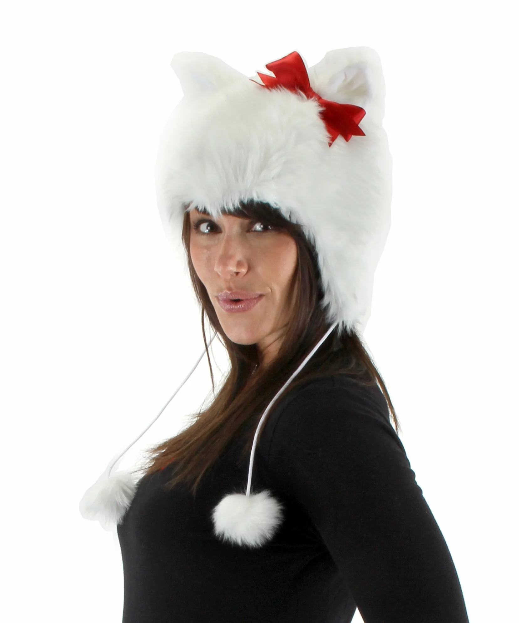 Christmas Kitty Hat is made of cotton and twill, with cute balls at end ties and a pretty red bow. One Size fits most.