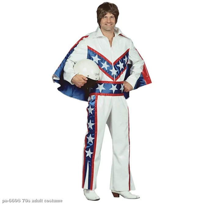 Looking for adventure? Look no further with this Daredevil Adult Costume. This adult costume includes a white jumpsuit accented in red and blue stripes with white stars, a matching cape, and a belt. Whether you’re as daring as Evel Knievel or a little more on the safer side, you are sure to look like you’re about to perform a danagerous stunt in this adult dare devil costume.