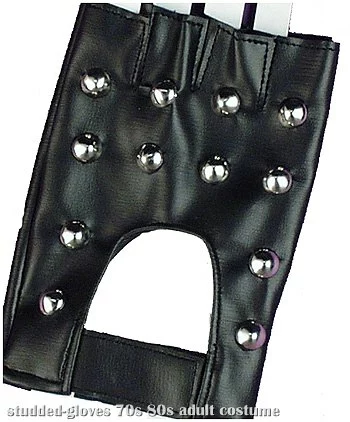Black Studded Fingerless GlovesDon’t hit the road without these biker gloves! The fingerless gloves are 100% PVC and are embellished with round, silver studs on the top. They are black and have the appearance of leather. The gloves are secured around the wrist with velcro and feature a small opening above the velcro. Ride all day and night with these costume gloves!