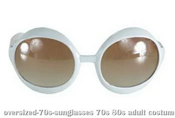 White Oversize SunglassesRock out like the legendary Elton John in these White 70s Sunglasses. These sunglasses have large, round lens that are tinted. They are UV 400 and will protect your eyes from the sun. The white frame is thin and gets thicker around the lens. Rectangle and circle cutouts embellish the side of the sunglasses. These funky sunglasses are made for both men and women.