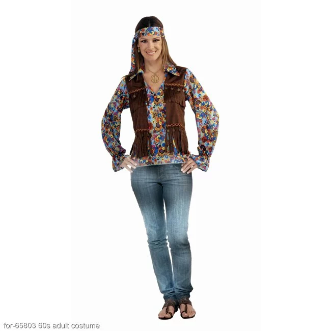 Get down with the 60s and soak up all that love, peace and harmony with our Women’s Groovy Hippie Costume Kit. Enjoy the traditional folk music and psychedelic rock scene from the 60s era for the full experience. Our Women’s Groovy Hippie Costume Kit includes a long sleeved collared flower print shirt, attached faux suede vest with fringe and bronze coins dangling from decorative trim and a matching floral print wide headband to tie around your head. Our Women’s Groovy Hippie Costume Kit will give you the opportunity to easily and instantly put together your own 60s hippie costume with room for adding more accessories for a unique look.